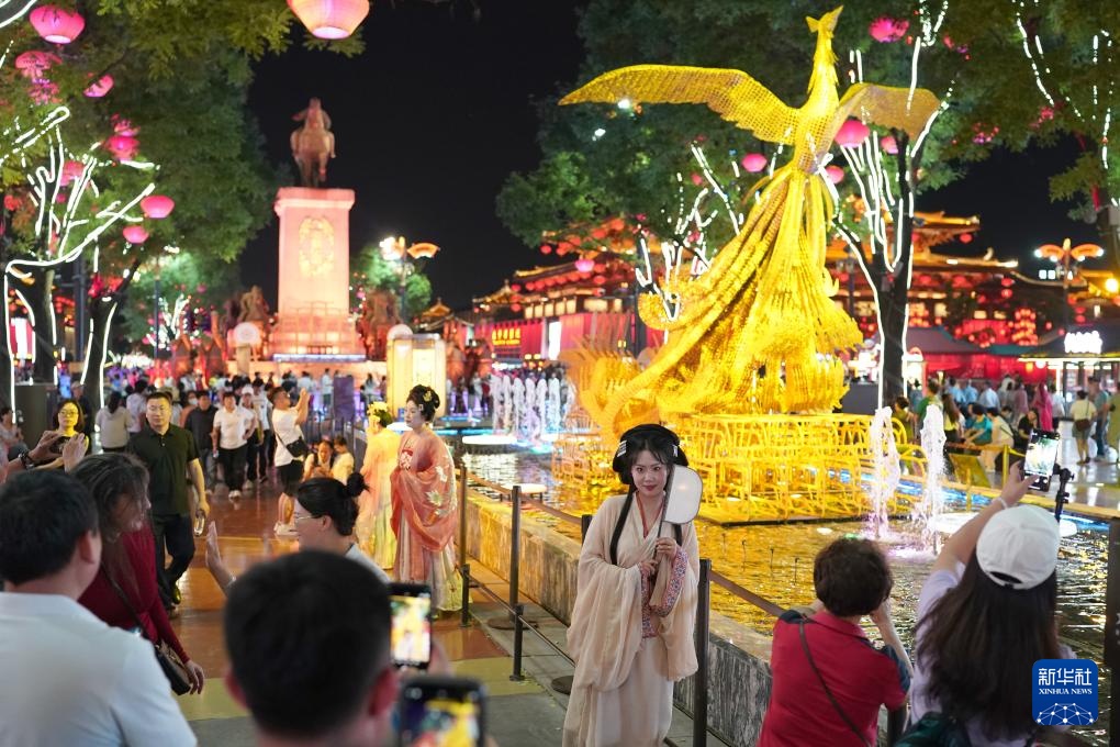 游客在西安大唐不夜城景区游览(2024年5月20日摄)。