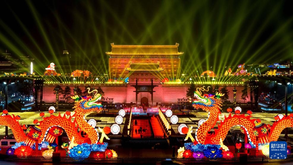 游客在西安大唐不夜城步行街游览(无人机照片,2024年2月2日摄)。