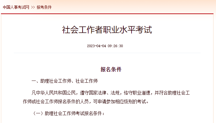 中国人事考试网关于社会工作者考试报名条件的具体规定,主要包括助理社会工作师、社会工作师以及高级社会工作师三个级别的报名条件。