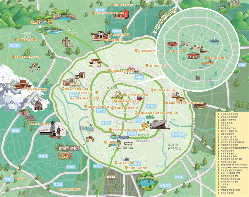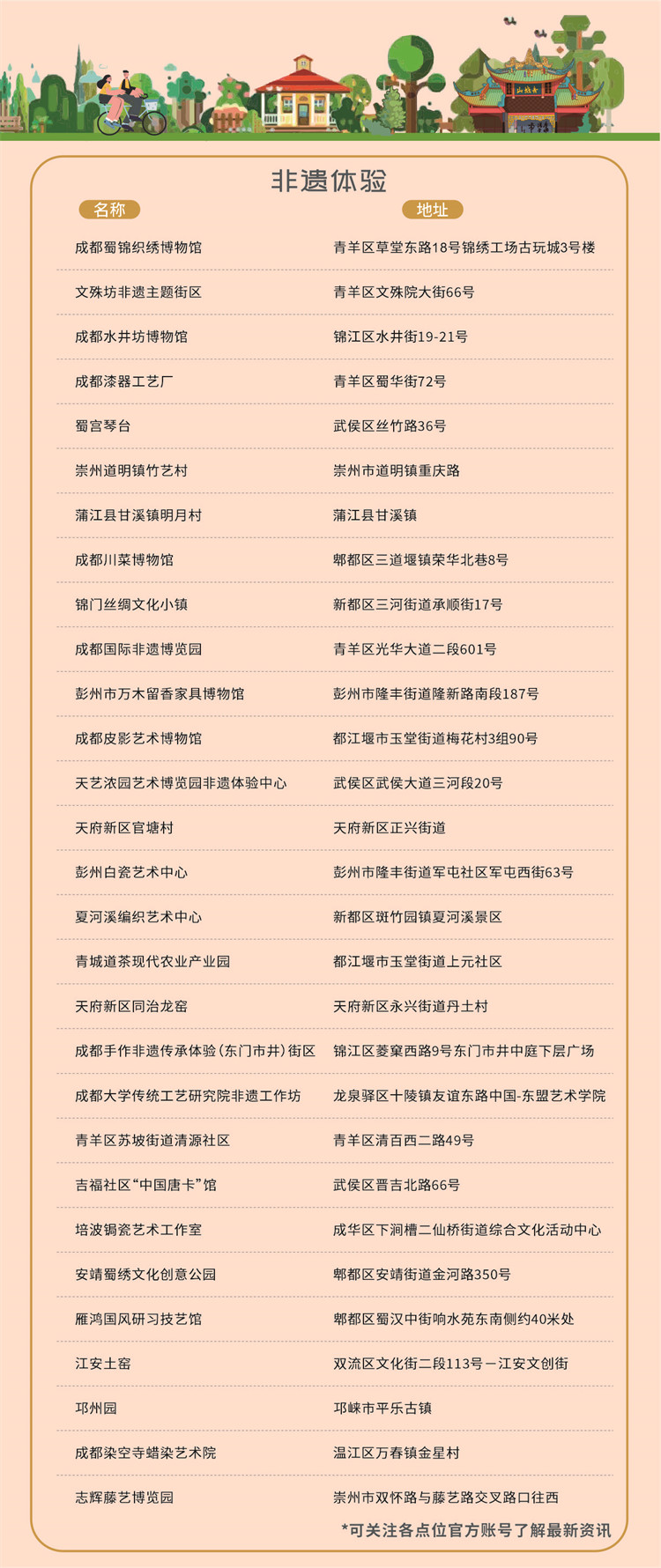 瑰宝成都非遗体验场所:瑰宝成都地图涵盖博成都蜀锦织绣博物馆、成都漆器工艺厂、成都川菜博物馆等全市29个非遗体验场所。