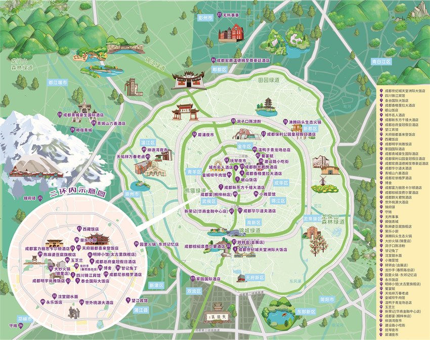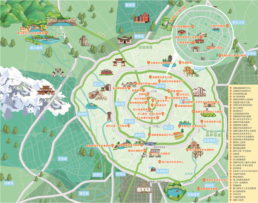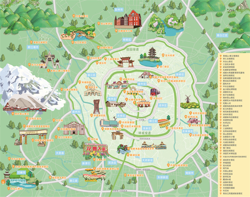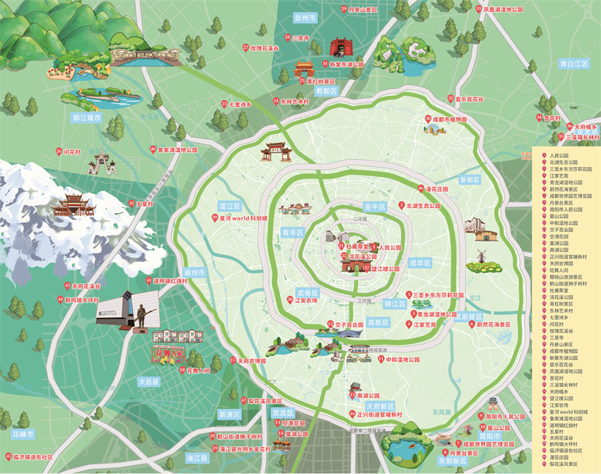 大美成都重点景区景点:大美成都地图包含青城山-都江堰景区、安仁古镇景区、天台山景区等全市50个景区点位。