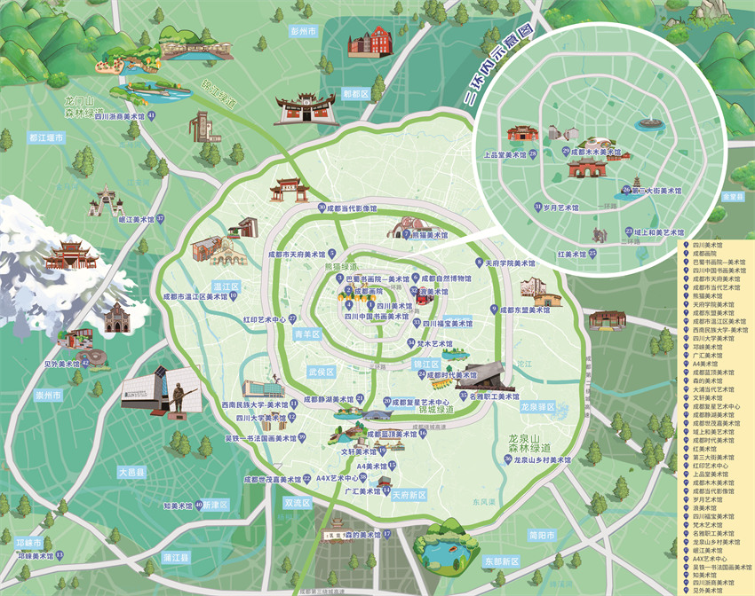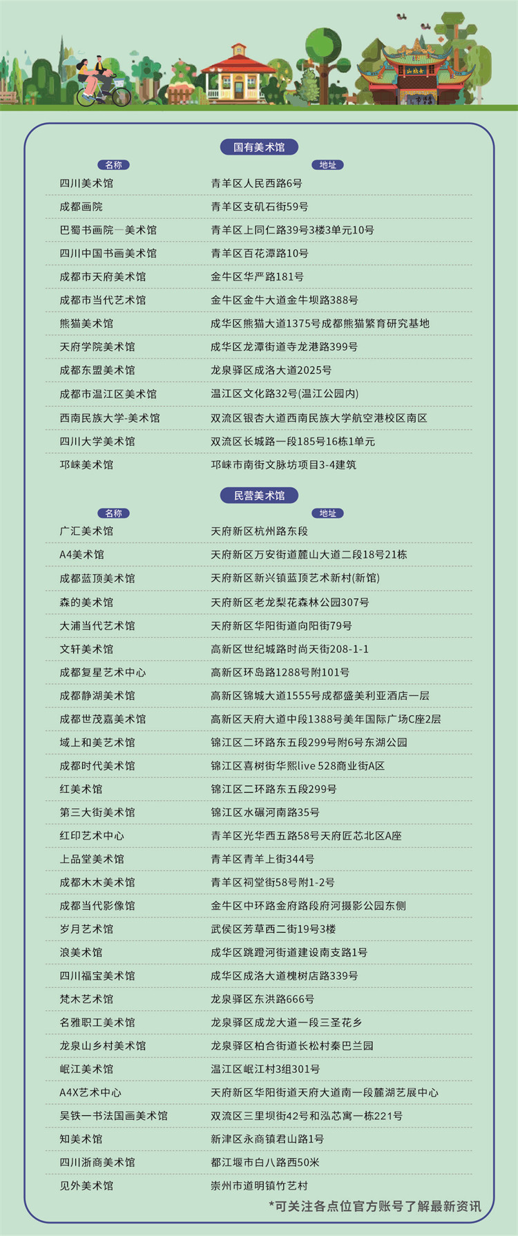 艺术成都重点美术展馆:艺术成都地图包含四川美术馆、成都画院、成都市当代艺术馆等全市42个文化展览点位。