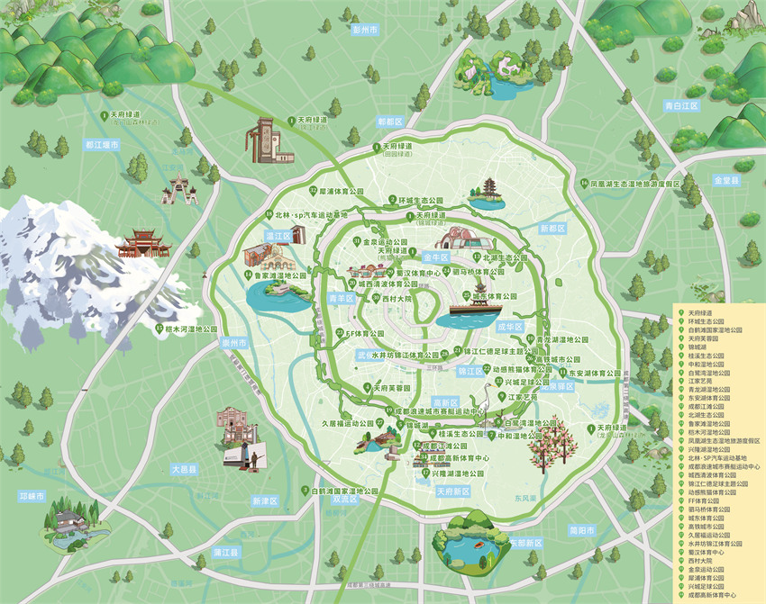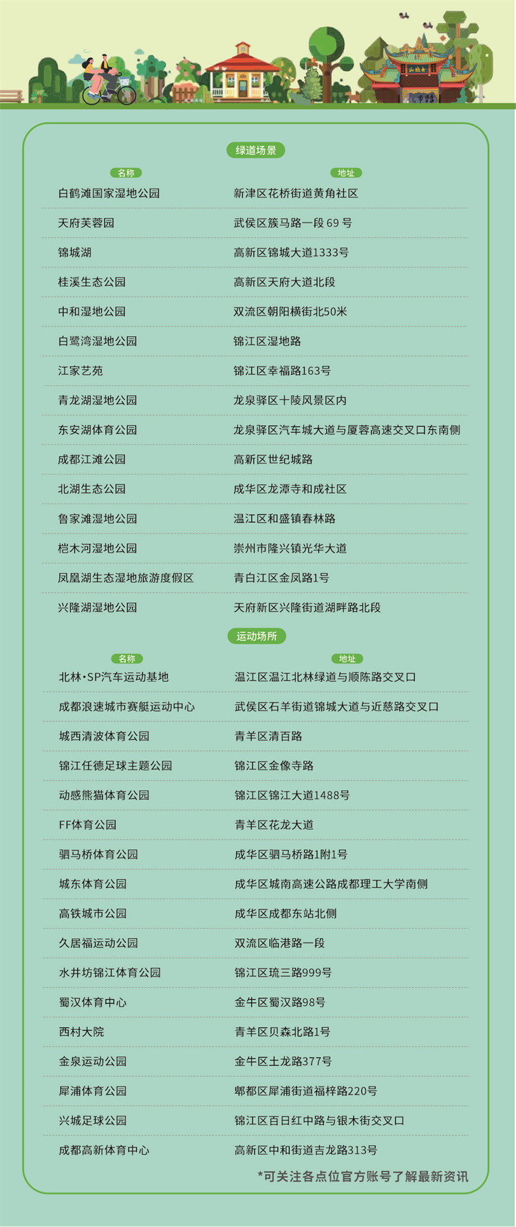 绿动成都绿道运动场所:绿动成都地图涵盖天府绿道、环城生态公园、白鹤滩国家湿地公园等全市34个绿道运动点位。