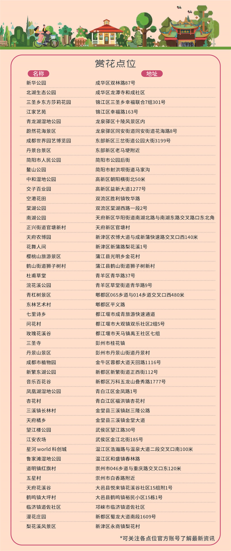 繁花成都春日赏花场景:繁花成都地图涵盖人民公园、北湖生态公园、江家艺苑等全市47个赏花点位。