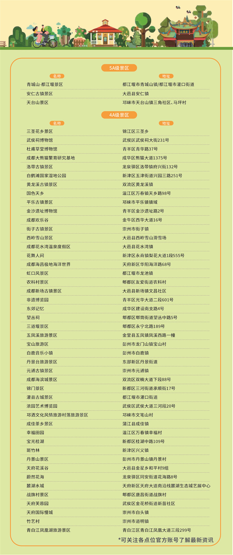 耍成都,赏春天,值此春和景明之际,成都文旅策划推出10份春季系列文旅地图,覆盖全市春日繁花场景、古镇街区、美术展览、文博展览、演出场馆、景区景点、绿道运动、住宿美食、非遗体验、潮玩地带等,为国内外游客开启便捷、高效、优质的文旅新旅程。