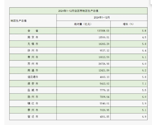 日前,江苏省统计局公布了2024年江苏13个设区市地区生产总值(GDP)数据。