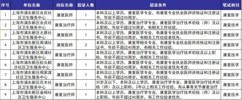 浦东新区新闻办说,该区7个社区卫生服务中心正在招聘9个岗位共11名康复专业人员,要求具备符合职位规定的条件、学历、证书、职称等。考生可通过浦东公共人力资源公开招聘平台(exam.pdhr.com)网上报名,报名时间为8月17日至23日。详见↓