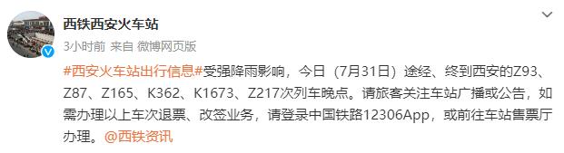 据西铁西安火车站官微消息,受强降雨影响,今日(7月31日)途经、终到西安的Z93、Z87、Z165、K362、K1673、Z217次列车晚点。请旅客关注车站广播或公告,如需办理以上车次退票、改签业务,请登录中国铁路12306App,或前往车站售票厅办理。