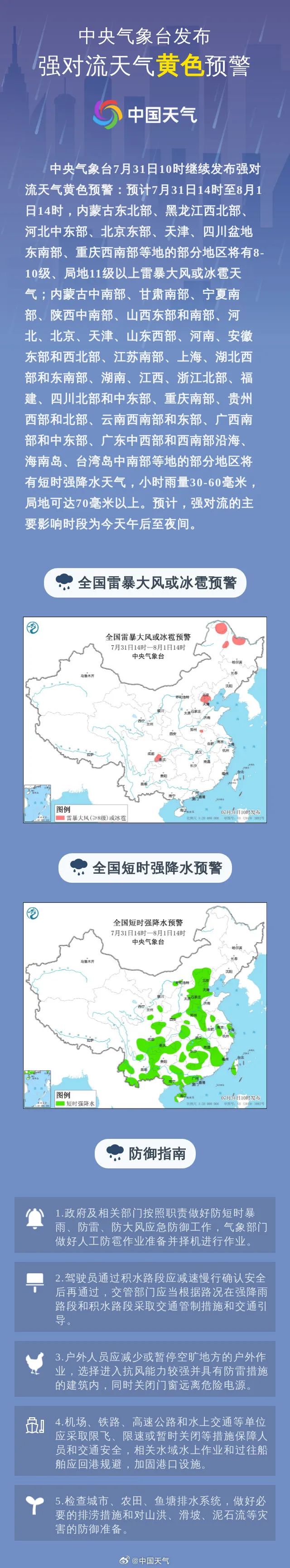 中央气象台7月31日10时继续发布强对流天气黄色预警:预计7月31日14时至8月1日14时,内蒙古东北部、黑龙江西北部、河北中东部、北京东部、天津、四川盆地东南部、重庆西南部等地的部分地区将有8-10级、局地11级以上雷暴大风或冰雹天气;内蒙古中南部、甘肃南部、宁夏南部、陕西中南部、山西东部和南部、河北、北京、天津、山东西部、河南、安徽东部和西北部、江苏南部、上海、湖北西部和东南部、湖南、江西、浙江北部、福建、四川北部和中东部、重庆南部、贵州西部和北部、云南西南部和东部、广西南部和中东部、广东中西部和西南部沿海、海南岛、台湾岛中南部等地的部分地区将有短时强降水天气,小时雨量30-60毫米,局地可达70毫米以上。