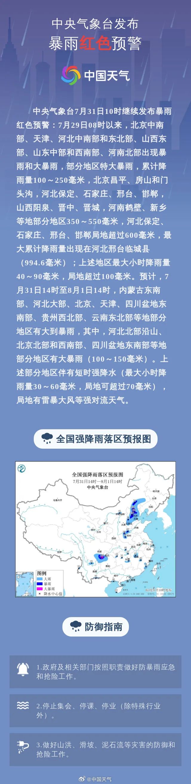 7月31日8点59分,河北省气象台发布暴雨红色预警:预计31日白天到夜间,张家口南部、承德南部、唐山西部、保定、雄安新区、廊坊、石家庄北部有暴雨到大暴雨(50~150毫米),个别地点累计可达250毫米以上;石家庄邢台邯郸三个地区西部有大雨到暴雨,局地可达70毫米以上。降雨时局地伴有短时强降水、雷电、短时大风等强对流天气。