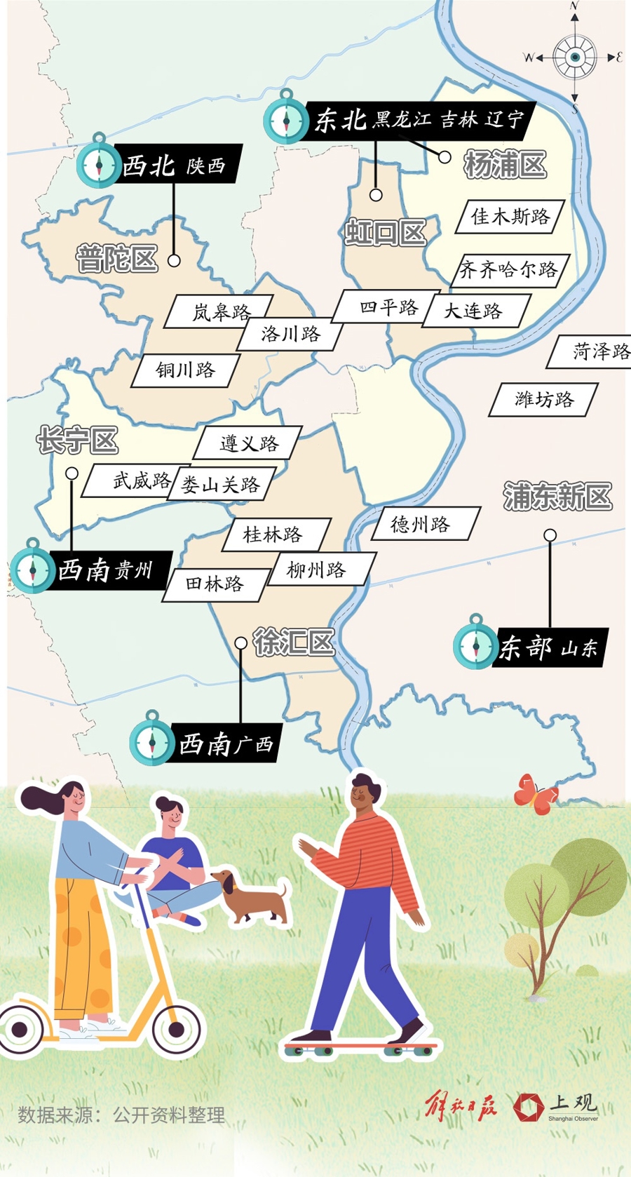 齐齐哈尔路, 长春路,大连路,佳木斯路……虹口、杨浦区大量采用了东北省的地名作为路名;桂林路,柳州路,田林路,桂平路……位于城市西南位置的徐汇区,则钟情于西南方位的广西地名。