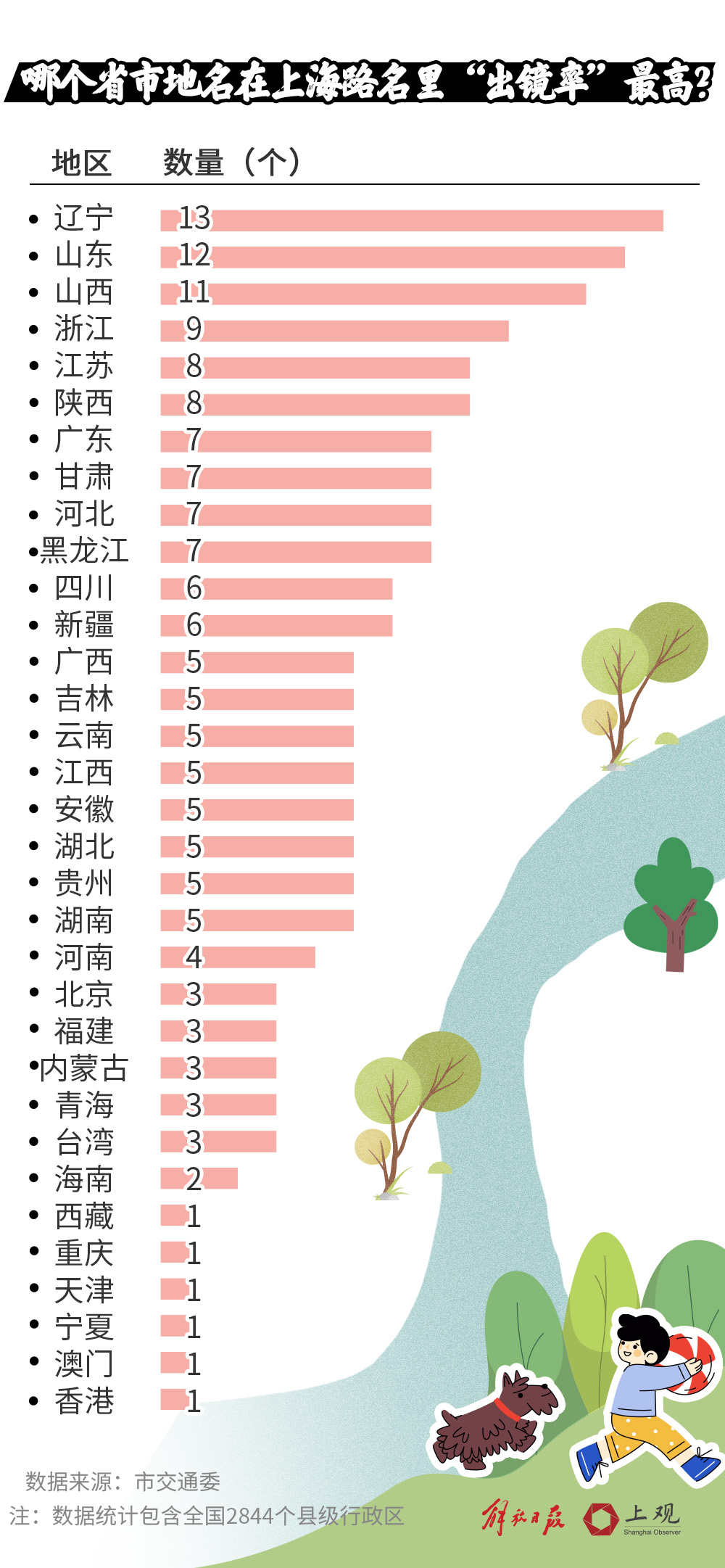 辽宁、山东、山西是上海道路采用地名最多的省份,分别有13、12、11个城市地名出现在上海街头。