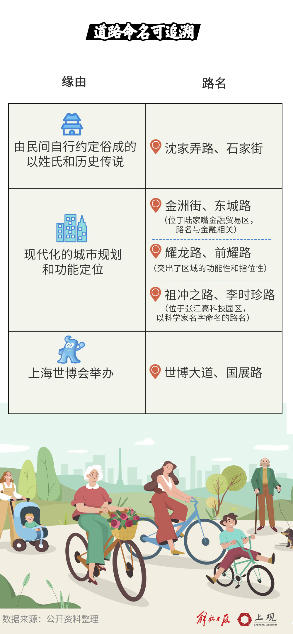 像沈家弄路、石家街,则是以姓氏或民间传说命名;世博大道、国展路等,来自于上海世博会;金洲街、东城路……陆家嘴金融贸易区的路名多与金融相关;祖冲之路、李时珍路,张江高科技园区的路名则以科学家名字命名。