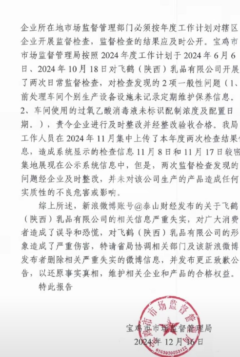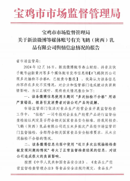 一份网络流传“宝鸡市市场监督管理局关于新浪微博等媒体账号有关飞鹤(陕西)乳品有限公司舆情信息情况的报告”显示,针对近期的网络自媒体传闻,“近日多次出现抽检检查被发现问题的情况”夸大了正常监督检查结果的信息,对该公司造成很大的负面影响。