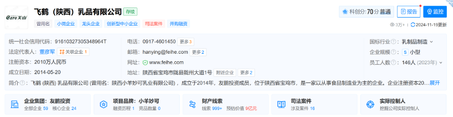 据了解,飞鹤陕西公司于2014年5月成立,是黑龙江飞鹤乳业有限公司的全资子公司,法定代表人为董彦军,曾用名为陕西小羊妙可乳业有限责任公司(简称“小羊妙可”),地处奶业资源丰富的陕西省宝鸡市。