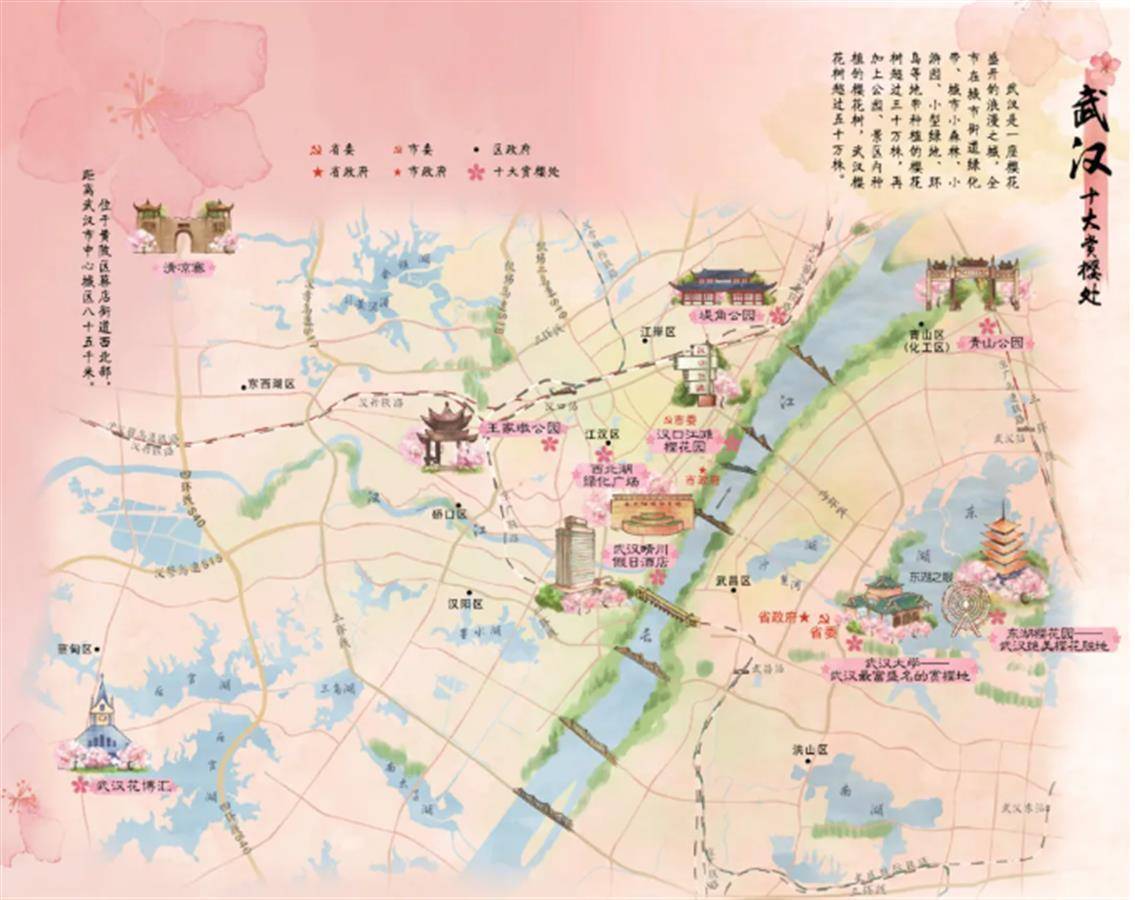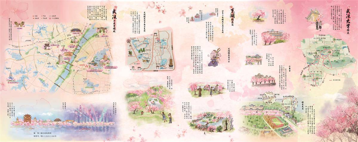 这张樱花地图可不简单,设计上花了不少心思。地图采用了新中式漫画风格,把水墨淡彩和水彩技法结合在一起,既有传统国画的韵味,又带点现代小清新的感觉。地图上还用粉色调渐变渲染,配上吉祥云纹、樱花瓣这些元素,简直浪漫到不行!更厉害的是,地图还通过地理坐标把湖北各地的樱花景点串了起来,顺便还融入了荆楚文化的历史脉络,赏樱的同时还能涨知识,真是一举两得。