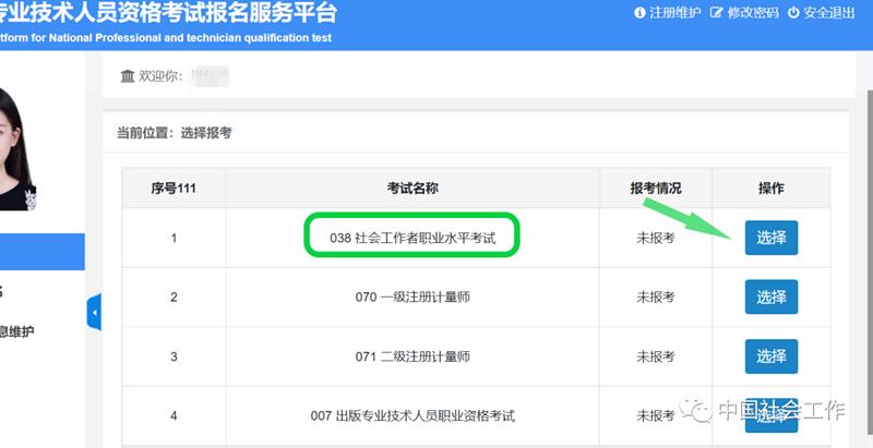 1.找到“038社会工作者职业水平考试”,点击“选择”,弹出“你已选择社会工作者职业水平考试”,点击“确定”。弹出信息确认后,点击“我已知晓”。