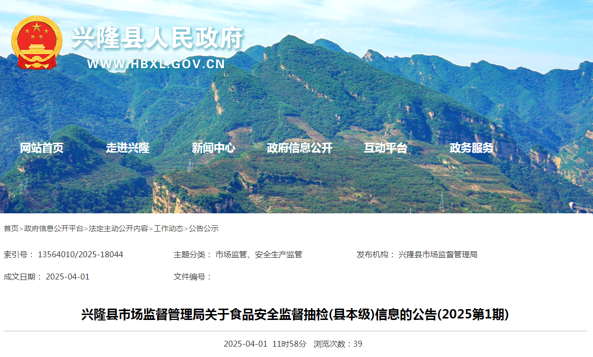 河北省兴隆县市场监督管理局关于食品安全监督抽检(县本级)信息的公告(2025第1期)