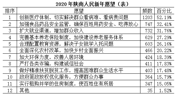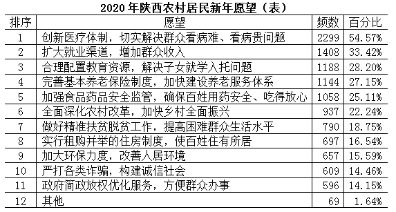 2020年中国将全面建成小康社会,实现第一个百年奋斗目标。2020年也是脱贫攻坚决战决胜之年。在这充满希望的一年里,我省人民有哪些愿望?对党委政府工作有哪些期盼?省统计局经过精心策划,认真组织开展了《2020年陕西人民新年愿望调查》,随机电话访问全省一万户城乡居民,广泛倾听民声、收集民意,了解他们在新一年里的美好愿望,为2020年党委政府工作提供决策参考。