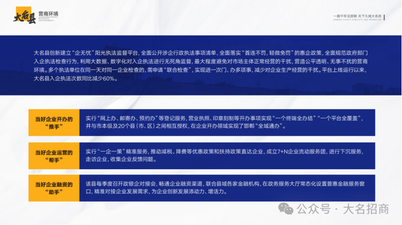 大名县创新打造“企无忧”阳光执法监督平台,以数字化手段赋能执法工作,将执法检查从线下纳入到线上平台,营造公平竞争、无事不扰的营商环境。近日大名县持续推进“企无忧”涉企矛盾纠纷化解入选河北省优化营商环境十大典型案例。