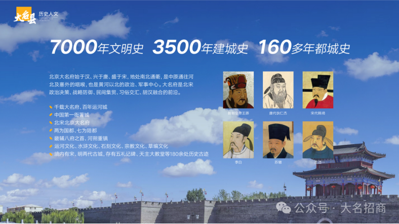 大名是一座历史悠久,底蕴厚重的灵秀之城,始于汉、兴于唐、盛于宋,有着7000年文明史、3500年建城史、160多年都城史;曾两为国都、七为陪都,是历代郡、州、府、路、道治所所在地,素有“河朔重镇”“北门锁钥”之称,史称“北京大名府”。京杭大运河漕运带来的便利,使当时魏州城的经济实力、政治地位迅速提升。从大运河的首端北京到末端杭州,因为运河孕育而产生的城市当中,唯一做都城的只有大名府。