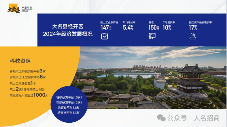 2024年,大名县经开区规上工业总产值147亿元,年均增长率5.4%;省级以上科技创新平台3家,省级以上工业研发中心6家,院士工作站1个,院士2名,高级称号人才超过1000人。