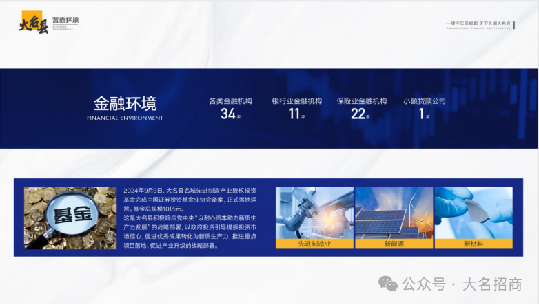 大名县拥有各类金融机构34家,涵盖银行、保险机构、小额贷款公司,可为企业家提供多层次、丰富的金融服务产品,满足企业成长过程中的多样化金融需求。