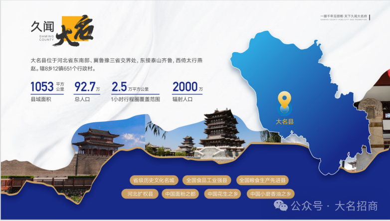 大名县位于邯郸市东南角,县域面积1053平方公里,辖20个乡镇,总人口92.7万。大名地处冀鲁豫三省交界处,1小时行程圈覆盖2.5万平方公里、辐射2000万人口。大名是省级历史文化名城,也是全国食品工业强县、全国粮食生产先进县。大名县作为河北省的重要农业县区,素有“冀南粮仓 ”之称,被誉为“中国面粉之都”“中国花生之乡”“中国小磨香油之乡”。