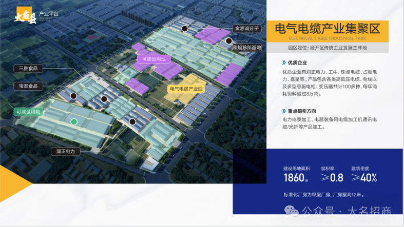 目前优质企业有工牛、珠峰电缆、占顺电力等;重点招商方向为电力电缆加工、电器装备用电缆加工及通讯光缆、光纤等产品加工。园区建设用地面积有1860亩,国资计划建设层高为12米的单层标准化厂房,可为招引的企业提供生产空间。
