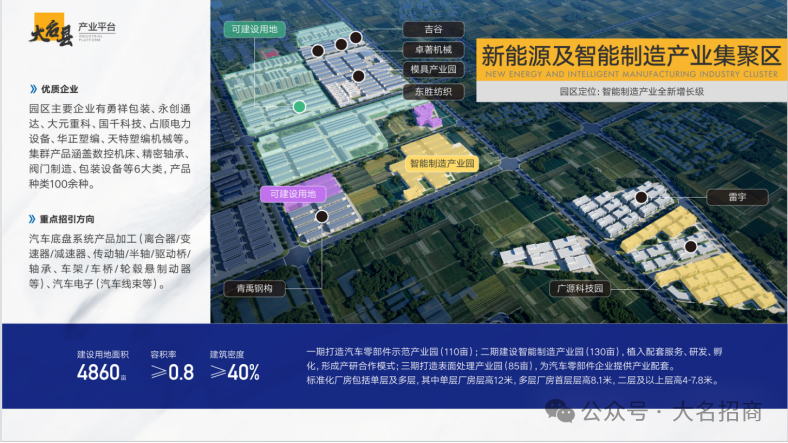新能源及智能制造产业园建设用地面积4860亩,全力打造大名智能制造产业全新增长极。目前园区重点企业有永创通达、大元重科等,集群产品涵盖数控机床、紧密轴承、包装设备等6大类。重点招商方向为装备制造、汽车零部件、智能输变电设备、工业机器人等。
