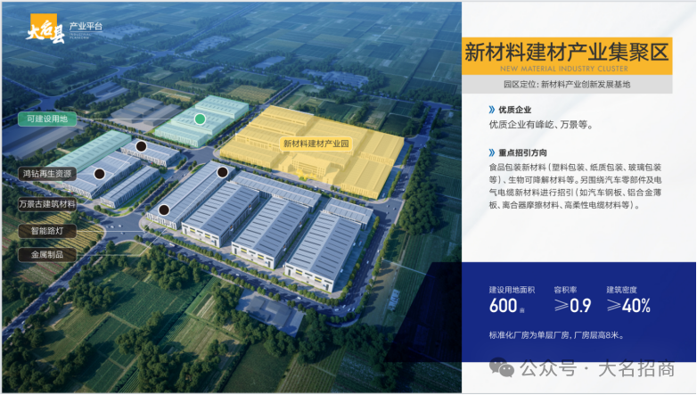 新材料建材产业园建设用地面积600亩,以单层厂房为主。重点招引食品包装新材料、生物可降解材料等。