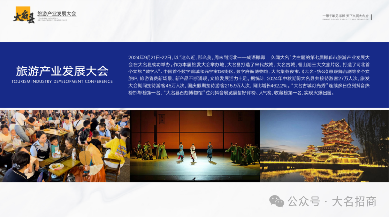 2024年9月21日-22日,以“这么近,那么美,周末到河北——成语邯郸 久闻大名”为主题的第七届邯郸市旅游产业发展大会在大名县成功举办,八方宾朋应邀而至,共赏邯郸文旅融合美景画卷,领略大名古城的非凡风采。作为本届旅发大会举办地,大名县打造了宋代故城、大名古城、惬山湖三大文旅片区,新建或改造提升了一批景观节点,创排《大名狄公》《久闻大名》等舞台剧,全面更新石刻博物馆、大运河博物馆展陈,植入大名宴、特色民宿、全息互动投影、夜间光影秀等内容,消费新场景、新产品不断涌现,文旅发展活力十足。据统计,2024年中秋期间大名县共接待游客27万人次,旅发大会期间接待游客45万人次,国庆假期接待游客215.9万人次。