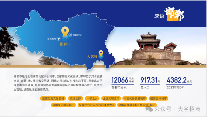 邯郸总面积1.2万平方公里,常住人口917万人,2023年GDP达4382.2亿;是京津冀协同发展和中原经济区区域性中心,也是东出西联、通南达北的重要节点。