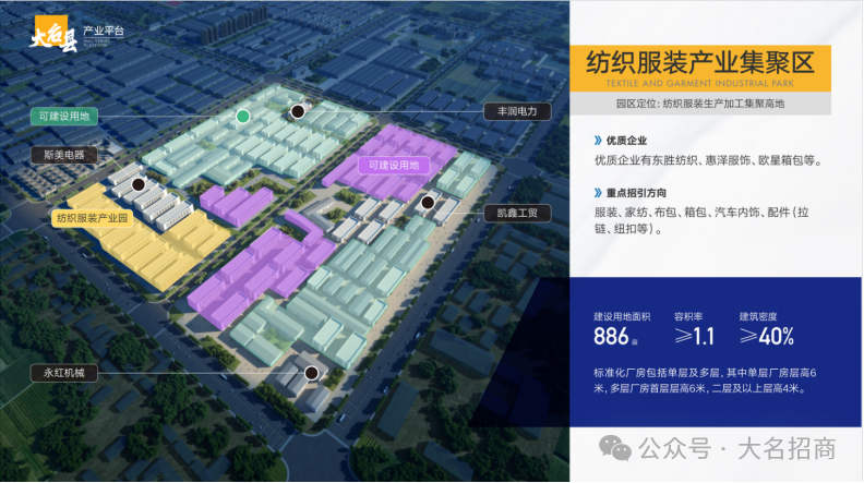 纺织服装产业园聚力打造上下游生产加工集聚高地,优质企业有东胜纺织、惠泽服饰等。重点招商方向为服装、家纺、箱包等。规划886亩的专业园区,涵盖单层及多层厂房,可满足企业的多样化需求。