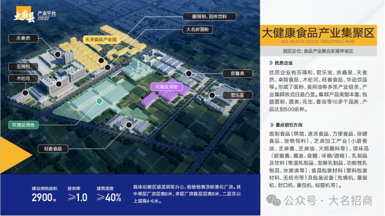 食品产业园总建设用地面积2900亩,围绕五得利、君乐宝、京馨泉等本地龙头企业,招商引面制食品、调味品、乳制品及食品包装材料。其中一期约100亩,重点聚焦大名优势的小磨香油产业进行规划提升,打响大名小磨香油全国知名度。