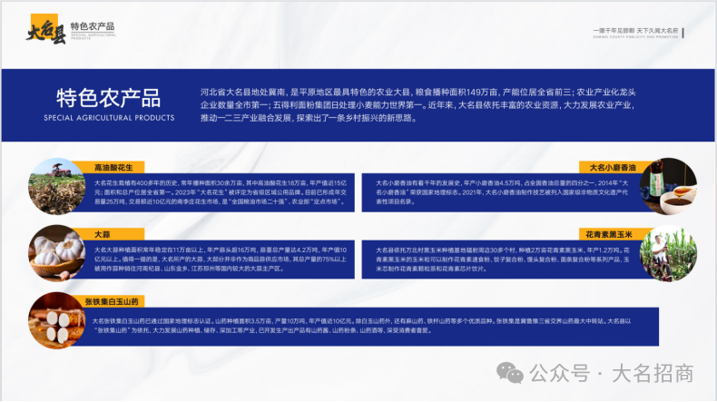 近年来,大名县依托丰富的农业资源,大力发展农业产业,推动一二三产业融合发展,为农业增效、农民增收打开了新空间,探索出了一条乡村振兴的新思路。截至目前,全县有高油酸花生、山药、大蒜等十几个特色品种。