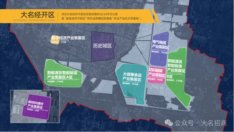 河北大名经济开发区,总规划面积42.04平方公里,是“省级经济开发区”和农业部确定的首批“农业产业化示范基地”。目前已形成“一区三园”格局(京府工业园、城西工业园、装备制造园)。2035 年规划期内可用建设用地面积 4.6 平方公里。