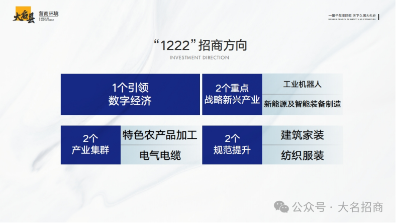 围绕构建更加成熟、系统完善的工业产业体系,2025年,重点实施“1222”培育工程,确立了1222招商方向:“1”,即突出抓好数字经济这个引领性产业,依托数字科创产业园,创新数字应用新场景,积极推进企业智改数转。第一个“2”,即重点支持以工业机器人、新能源及智能装备制造产业为特色的战略性新兴产业,扶持本地永创通达、大元重科等龙头企业持续做大做强,积极引进、培育一批上下游协作企业,完善产业链条;强化关键技术研发,深入实施“机器人+”应用行动,拓展多元化应用场景。加快推进河北建投“风+储”等重点项目建设,引导新能源汽车零部件企业集聚发展;第二个“2”,即培育壮大特色农产品加工、电气电缆2个支柱产业集群,围绕“一面两油”(面粉;高油酸花生油、小磨香油)、“三品一菜”(面制品、饮品、调味品;预制菜),进一步扩规模、增品种、提品质、拓市场,注重技术创新和品牌建设,打造千亿级农产品加工产业集群;积极推进工牛、航牌、珠峰等企业集团化运营,积极引育产业链上下游项目,进军专用线缆、汽车线束、智能输变电设备等细分、创新领域,打造百亿电气电缆产业集群。第三个“2”,即加快建筑家装、纺织服装2个传统产业规范提升,启动散、乱、小企业搬迁腾退入园,积极推进制造业基础再造工程,围绕各产业链关键环节、核心领域,加大技改力度。