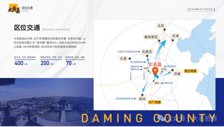 大名地处中原,位于京津冀协同发展经济圈、中原经济圈、山东半岛经济圈三大“经济圈”叠加中心。距北京、天津、雄安新区400公里左右;距离石家庄、济南、郑州三个省会城市200公里左右;距离河北邯郸、山东聊城、河南濮阳三个地级市70公里左右。县内大广高速、106国道、215省道纵贯南北,邯济铁路、青兰高速、邯大公路横贯东西,设有5个高速口。目前已形成10分钟上高速、50分钟乘高铁、60分钟坐飞机的便捷交通格局。