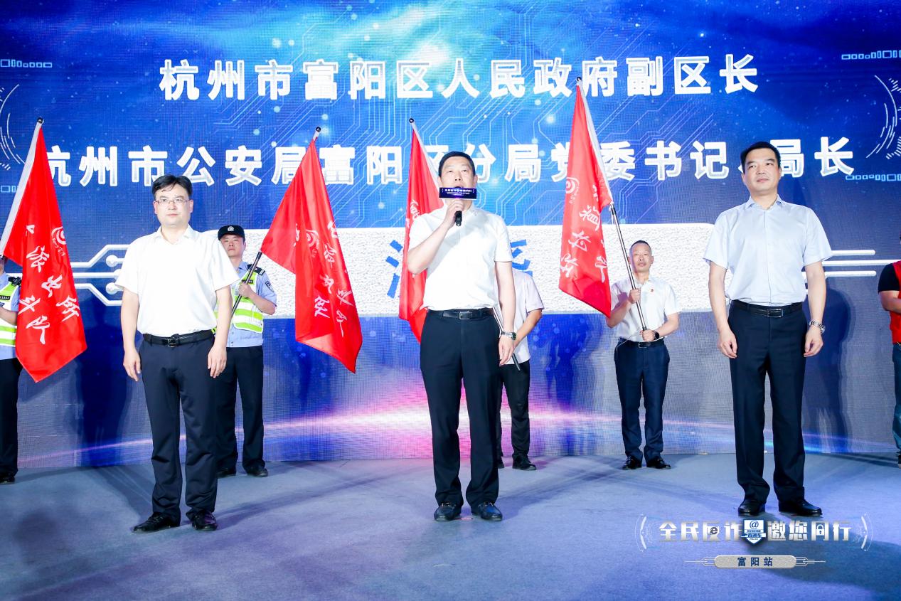 富阳区副区长、公安富阳分局局长沈尧,区委政法委常务副书记颜炎,富春街道党工委书记汪军飞给杭州市公安局富阳分局城东派出所反诈战斗队、杭州市公安局富阳分局城西派出所反诈战斗队、富阳区富春街道反诈宣传队、富阳区富春街道村社反诈宣传队、富阳区富春街道反诈志愿者服务队五个战斗组授旗,战斗组代表共同挥舞旗帜,高喊口号“全民反诈,守护万家”,反诈热情高涨。