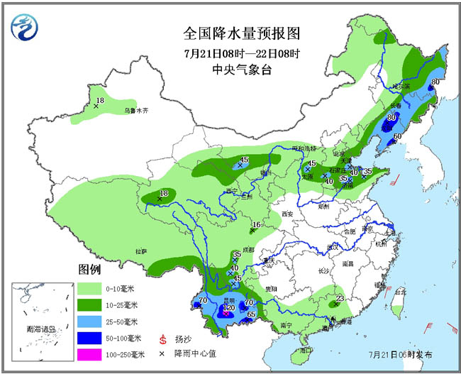 21日08时至22日08时,东北地区中东部、华北中南部、青海北部、甘肃西部、四川南部、云南等地有中到大雨,其中,辽宁北部和东部、吉林西南部、黑龙江东南部、云南中南部等地的部分地区有暴雨,局地大暴雨(100~120毫米),上述局部地区有短时雷雨大风等强对流天气。台湾以东洋面有6~7级、阵风8级的东北风,南海东北部将有6~7级、阵风8级的西北风。