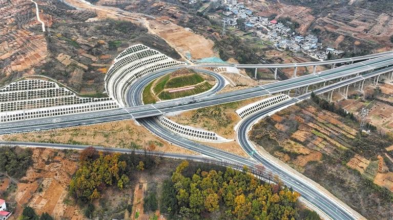 航拍的丹(凤)宁(陕)高速公路竹林关枢纽立交(资料照片)。