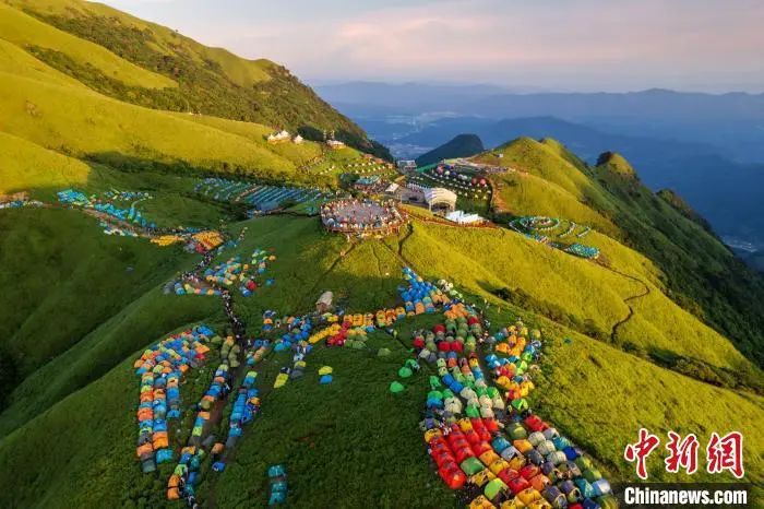 五颜六色的帐篷整齐绽放在漾漾山光下