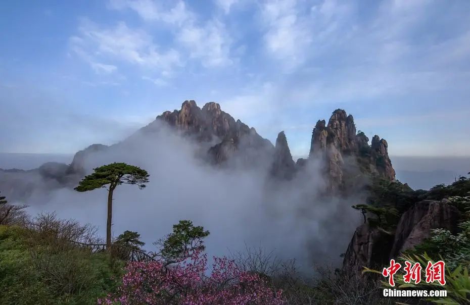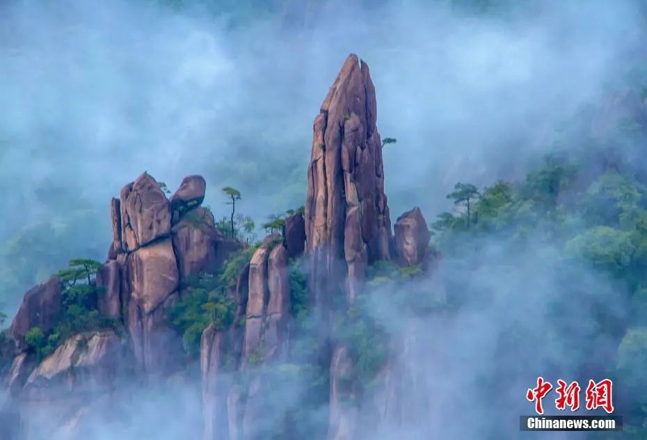 云雾缭绕下的三清山“东方女神”和“巨蟒出山”景观。刘占昆 摄
