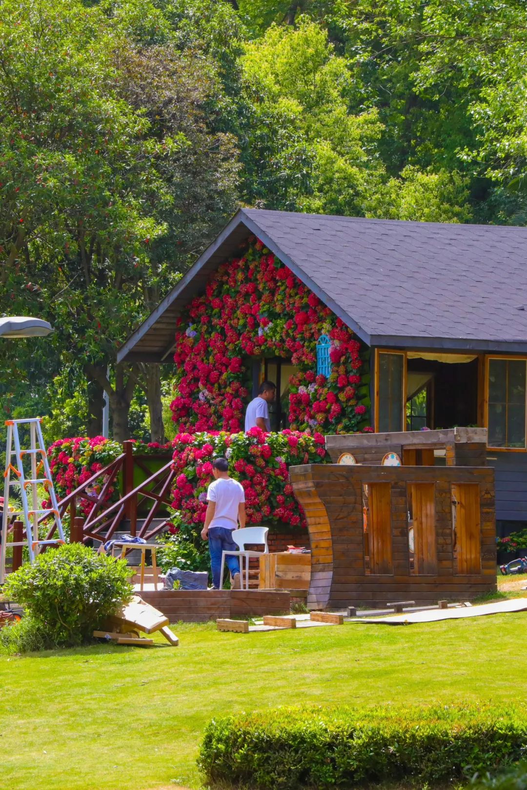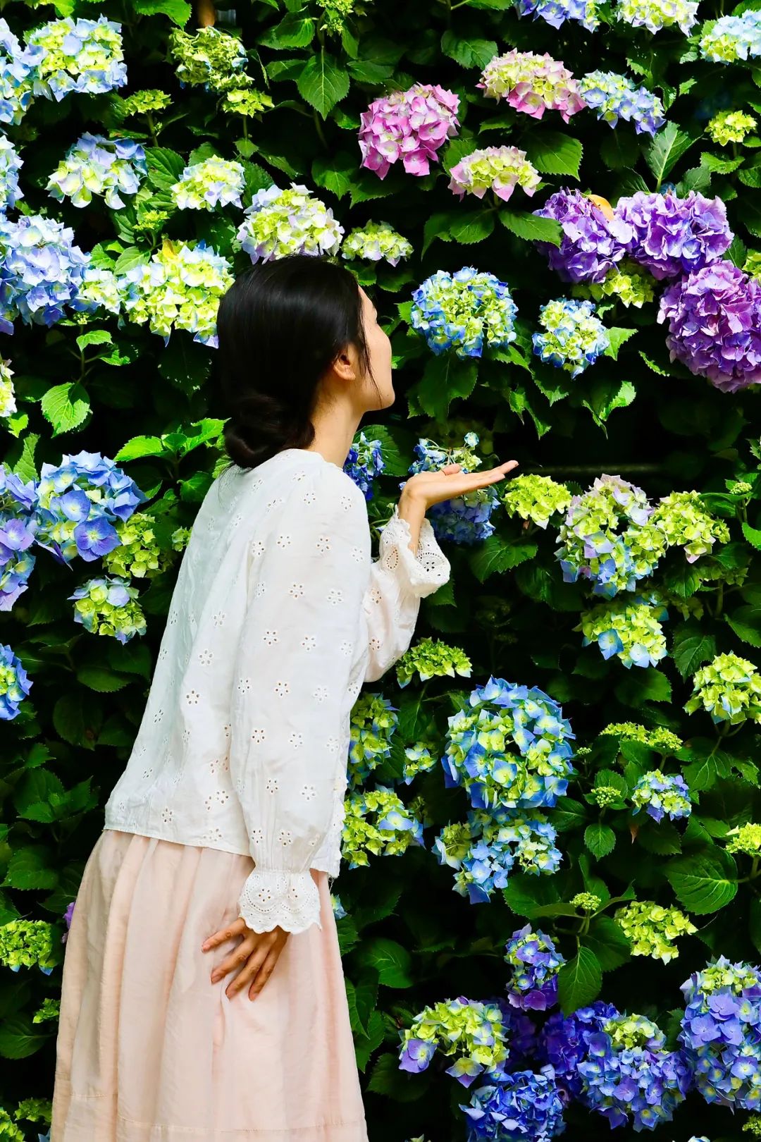 2.手扶花枝、背对镜头回头、手腕/锁骨旁放单朵绣球花,都很出片!