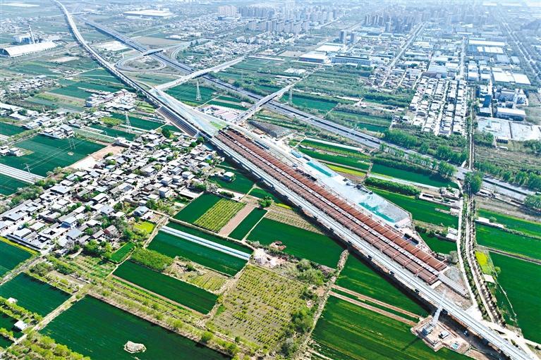 图为4月18日航拍的西延高铁铺轨工程启动现场。