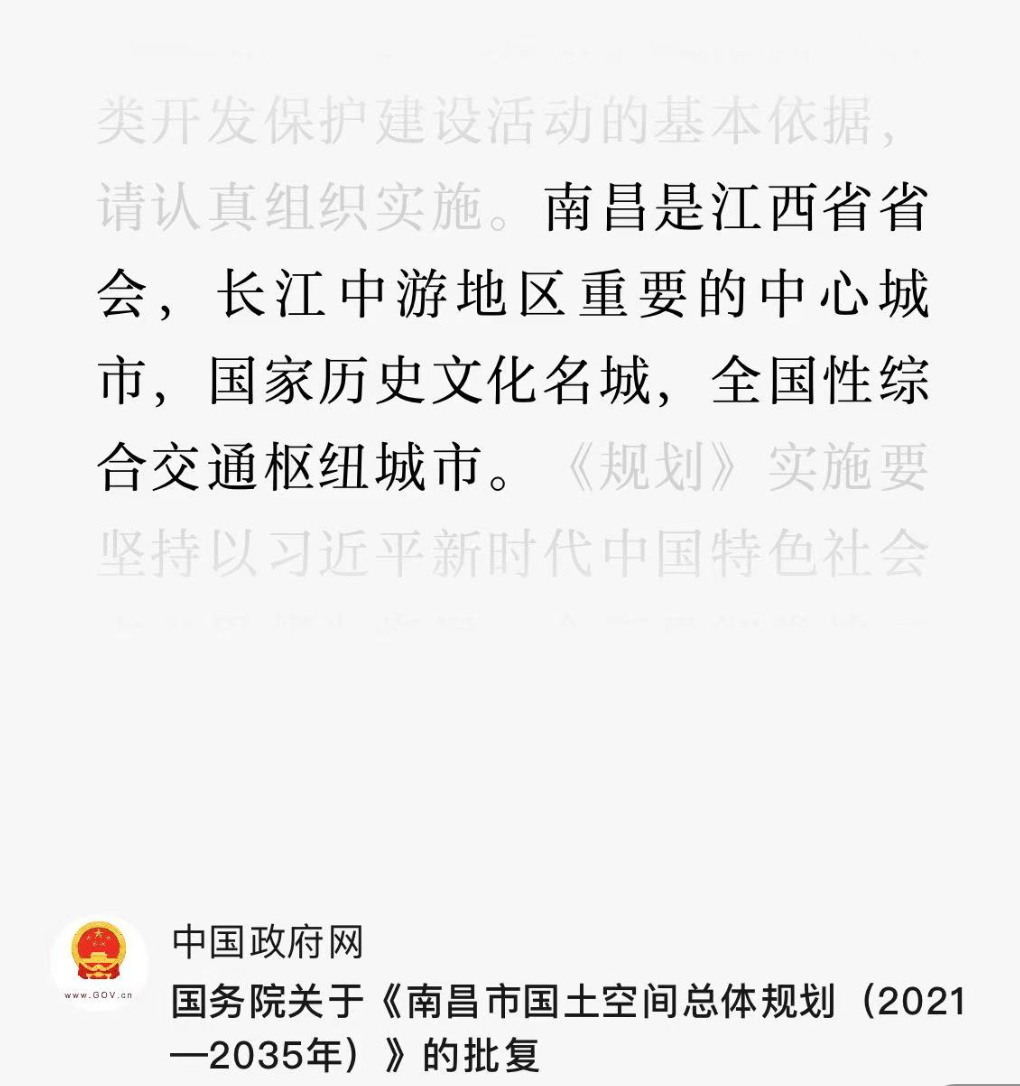 日前,国务院批复了《南昌市国土空间总体规划(2021—2035年)》。规划明确,南昌是江西省省会,长江中游地区重要的中心城市,国家历史文化名城,全国性综合交通枢纽城市。