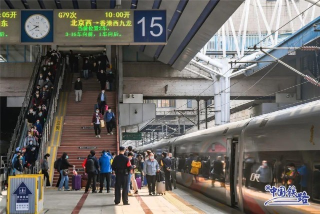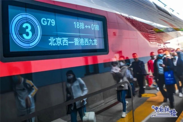 10时整,G79次列车从北京西站15站台发出,于当日18时31分直达香港西九龙站。这趟列车是今年北京首趟开往香港的高铁列车,也标志着京津冀地区进港高铁列车正式恢复运营。