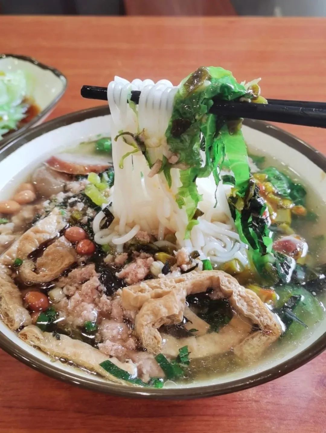 生榨米粉是用发酵后的米浆加上各种配料后使用榨粉器制作而成,这样做出的粉口感更加软糯,粉的分量很足,可以根据个人食量选择 2 两或者 4 两。