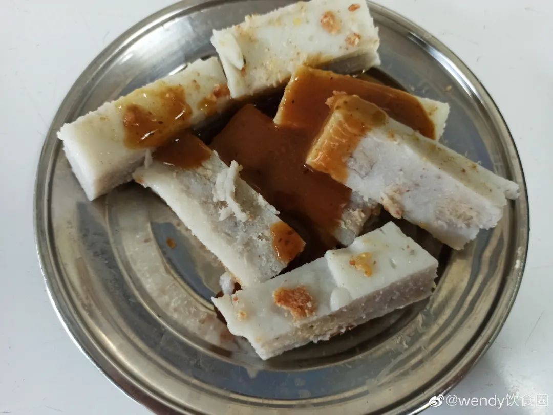 除了粉饺以外,这里的芋头糕、马蹄糕也非常值得一吃。做法十分质朴,充满了古早味,在一块方方正正的芋头糕、马蹄糕上淋上浓稠的汤汁,吃起来口感绵绵糯糯,分量非常扎实,饱腹感很强。